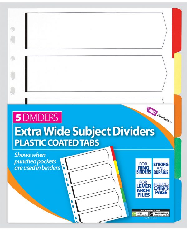 A4 File Dividers Plastic Coloured Tabs Subject Filing Extra Wide. Extra Wide Subject Dividers These Extra Wide Subject Dividers are perfect for your everyday filing requirements, whether it’s for study or business. These dividers contain 100% post-consumer recycled content and are pre-punched, ready to be filed in an A4 folder or lever arch file. Subject Dividers These dividers are made of manila paper and come in assorted colours, making them perfect for colour-coordinating your papers. The binding is hole-punched, so you can easily organise your documents. These dividers are made of recycled materials and are recyclable, offering an eco-preferable option for your office supplies.